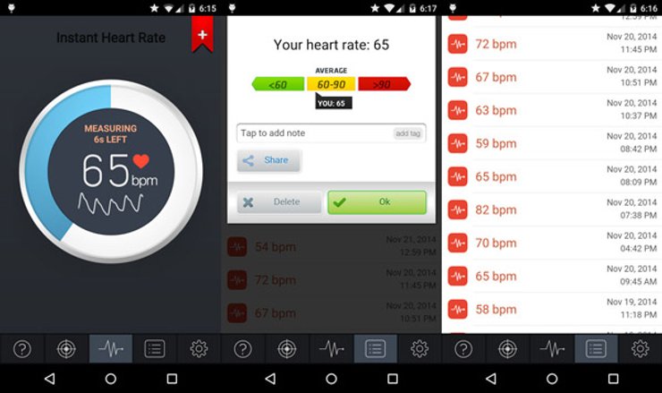 Частота сердцебиения — то, что интересует любого, кто решил заняться спортом и не навредить себе в процессе. Для того, чтобы узнать, как быстро бьется ваше сердце, больше не нужно нащупывать пульс или покупать дорогой пульсометр. Для измерения сердцебиение необходимо приложить палец к камере смартфона. Датчик камеры определит небольшие изменения цвета кожи, которые возникают в тот момент, когда к пальцу приливает кровь. Результаты измерений автоматически сохраняются, и вы сможете следить за тем, как развивается ваша сердечно-сосудистая система.