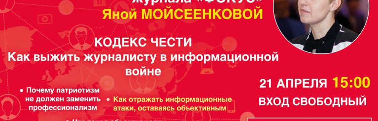 21 апреля главный редактор журнала «Фокус» Яна Мойсеенкова проведет открытую дискуссию на тему «Кодекс чести. Как выжить журналисту в информационной войне» со студентами факультетов журналистики. Мероприятие пройдет в стенах Национального Университета имени Т.Г. Шевченко