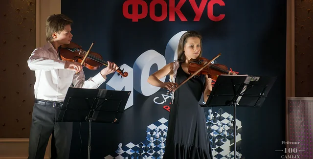 Прекрасным музыкальным обрамлением вечера стало выступление дуэта Two Violins - Ильи Бондаренко и Татьяны Жмендак, уникальных 13-летних скрипачей, победителей многих музыкальных конкурсов. Они уже успели выступить в знаменитом Карнеги Холл и на Балу Принца Гарри.