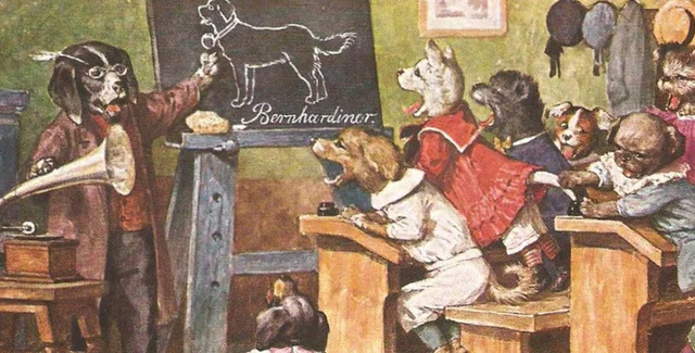 В школу идут щенки и котята — и все у них, как у людей: ранцы, форма, классы с партами и доской. Тут все понятно без объяснений: открытки предназначались детям, а кто же из детей не любит собачек и кошечек?