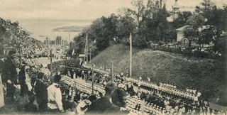 Когда Киев освободили от гитлеровской оккупации, кварталы Крещатика лежали в руинах. Пока горожане расчищали главную улицу, участники военного парада в честь Первомая 1945 года воспользовались Владимирской улицей. Перед Оперным театром установили трибуну для членов правительства и почетных гостей. Мимо них проходили подразделения героев-фронтовиков, только что вырвавших когти нацистскому зверю.