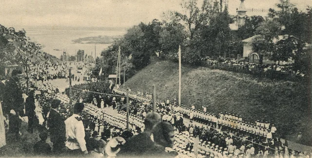 На протяжении 1917–1920 годов Киев пережил вереницу переворотов. При этом не раз победившая сторона устраивала в городе вооруженные манифестации. Иногда удавалось привязаться к конкретной праздничной дате, как это сделали большевики, проведя демонстрацию с военным парадом 1 мая 1919 года. Центральным пунктом церемоний была тогда древняя Софийская площадь. За полгода до этого на той же площади отметили свой успех завладевшие Киевом войска украинской Директории. Колоритное описание тогдашних событий вошло в роман Михаила Булгакова "Белая гвардия": "В синих жупанах, в смушковых, лихо заломленных шапках с синими верхами, шли галичане. Два двуцветных прапора, наклоненных меж обнаженными шашками, плыли следом за густым трубным оркестром, а за прапорами, мерно давя хрустальный снег, молодецки гремели ряды, одетые в добротное, хоть немецкое сукно".