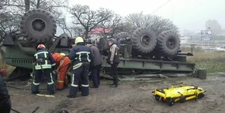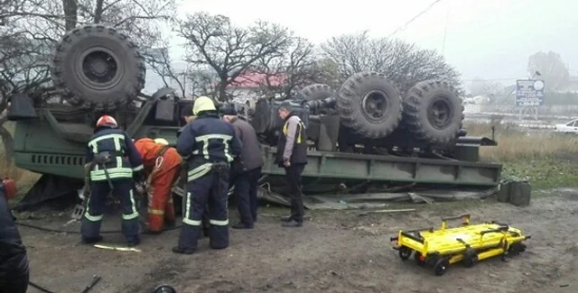 В Запорожье на перекрестке трассы Харьков-Симферополь и улицы Димитрова произошло ДТП - перевернулся военный грузовик КрАЗ.