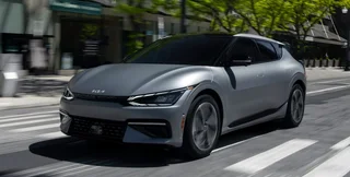 Экстерьер EV6 с носом "цифрового тигра" отличается явно выраженными складками капота и сужающейся к корме покатой крыше, что придает машине сходство с купе. Задние фонари объединены светодиодной полосой во всю ширину кузова, на верхней кромке багажной двери установлен аэродинамический спойлер.