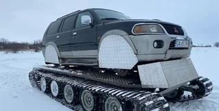 Mitsubishi Pajero Sport поставили на гусеничное шасси, так что получилось некое подобие трактора или танка. Это существенно улучшило проходимость в грязи или на снегу. К тому же, теперь автомобиль может разворачиваться на месте.