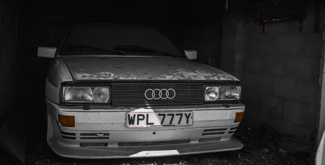 Audi Quattro Turbo не выезжал на дороги с 1994 года и покрыт ржавчиной. Модель ценится коллекционерами, ведь это первое в мире легковое авто с полным приводом.
