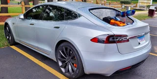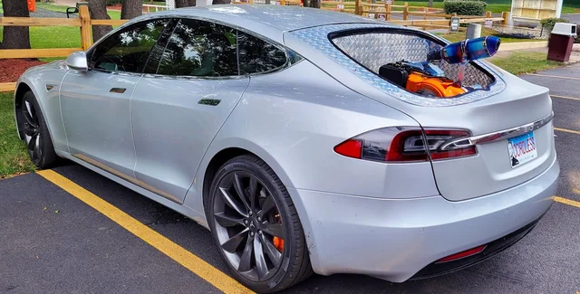При взгляде в анфас это обычный электрокар Tesla Model S, но сзади автомобиль изменен. Заднее стекло сняли и установили в багажнике небольшой одноцилиндровый бензиновый мотор объемом 400 куб. см.