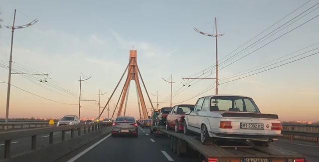На столичном Северном мосту заметили автовоз с тремя редкими BMW. Самое дорогое авто в коллекции стоит около 150 000 евро.