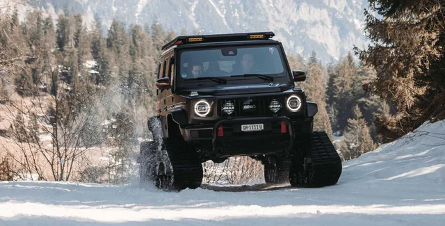Именно швейцарское ателье Delta 4X4 выполнило необычный тюнинг Гелендвагена . Гусеницы установили прямо на месте колес, то есть их у внедорожника четыре. Они выполнены съемными и летом автомобилю можно опять вернуть колеса.