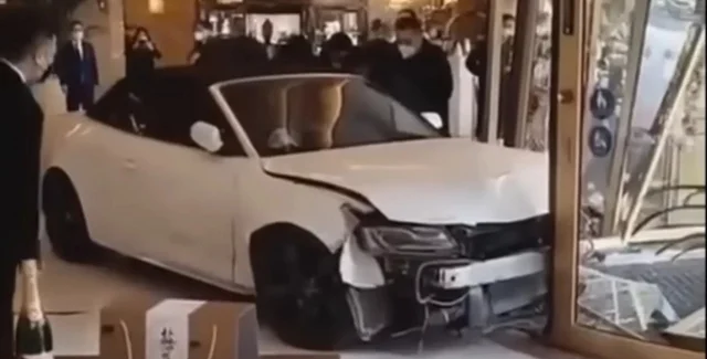 В ролике видно, как кабриолет Audi A5 разбивает входную дверь и прорывается в вестибюль отеля. Владелец пытается ездить по помещению, но на скользком полу авто заносит и оно несколько раз врезается. По счастливой случайности никто не пострадал.