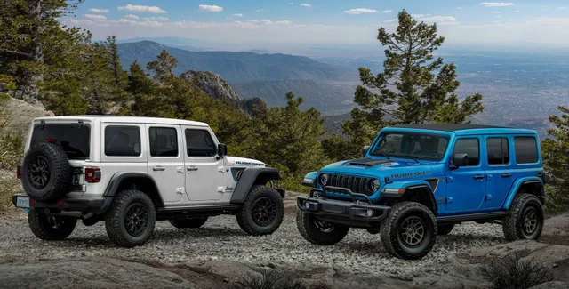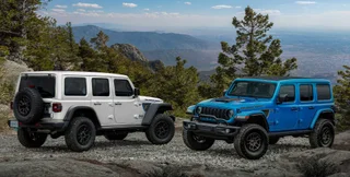 Jeep Wrangler Rubicon 20th Anniversary Edition узнается по особой решетке радиатора и стальным бамперам с дугами, а салон отделан красно-черной кожей. Внедорожник доступен только с топовыми двигателями – 6,4-литровым бензиновым 475-сильным V8 и гибридной установкой мощностью 375 л. с.