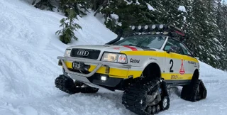 Купе Audi Quattro подготовили к серьезному бездорожью. Автомобиль поставили на гусеницы, добавили защиту днища и багажник на крыше.