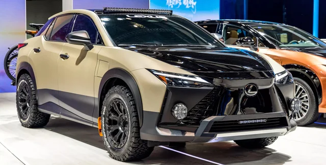 Электромобиль Lexus RZ подготовили к бездорожью. Ему увеличили клиренс на 20 мм и установили внедорожные шины BF Goodrich размером 265/60R18. Днище прикрыто защитными пластинами. Кроме того, появились выраженный пластиковый обвес и дополнительная оптика.