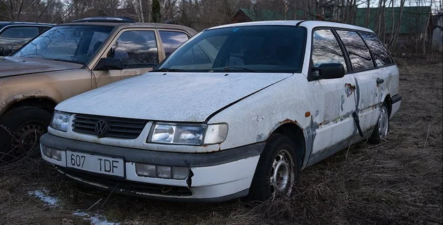 Универсал Volkswagen Passat B4 представляет из себя жалкое зрелище. После длительного простоя на улице он проржавел, краска на кузове облупилась, а местами проступила ржавична.
