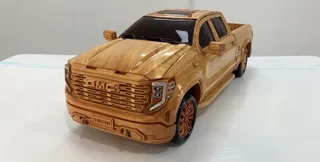 Сперва умелец берет деревянный брусок, а потом вырезает из него очертания пикапа. После шлифовки и распиливания он медленно превращается в реалистичную копию GMC Sierra Denali.