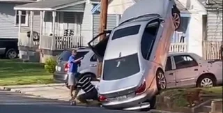 На видео не попал сам момент ДТП, поэтому можно только догадываться о том, как седан повис на линии электропередач. Автомобиль получил несколько повреждений кузова.
