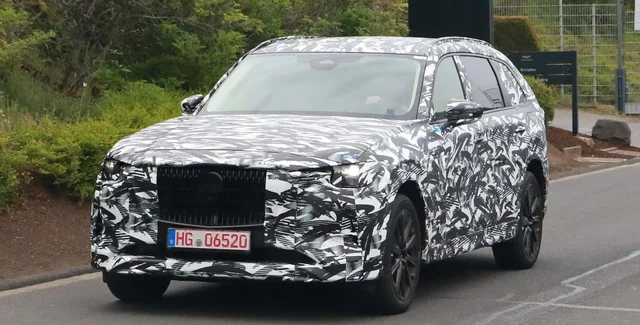 Кроссовер Mazda CX-80 обклеен камуфляжной пленкой, но детали его дизайна можно разглядеть. У кроссовера длинный капот и фирменная большая решетка радиатора. Автомобиль будет выдержан в стиле Mazda CX-60 и CX-90, с которыми делит платформу.