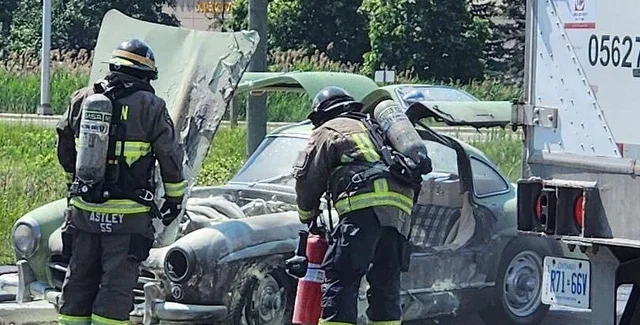 ДТП произошло фактически на ровном месте – Mercedes 300SL Gullwing загорелся во время движения по автомагистрали. К счастью, водитель и пассажир смогли быстро покинуть авто.