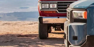 Передняя часть Toyota Prado 2024 отличается агрессивным рубленным дизайном. На фото также показали старый Toyota Land Cruiser FJ62 80-х – именно эта модель вдохновляла японских дизайнеров.