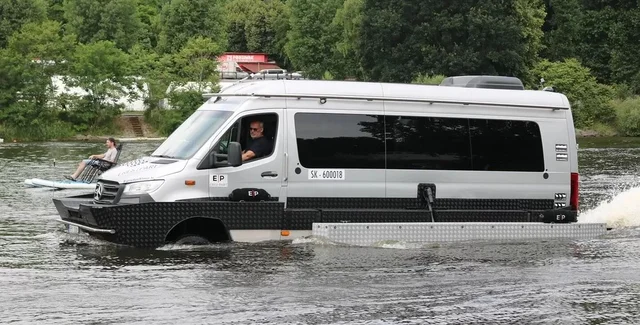 Mercedes Sprinter получил стальной корпус как у лодки и гребной винт. Микроавтобус оснащен сразу пятью моторами, а в его салоне поместятся 12 пассажиров.