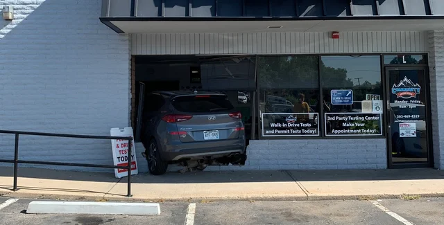 Иронично, что на входе в автошколу изображен слоган "Учись водить". Возможно, это не лучшая реклама, учитывая кроссовер, который врезался в здание.