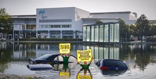 Активисты бойкотируют Международный автосалон в Мюнхене 2023. Ради акции группа людей затопила детали от трех автомобилей в озере перед выставочным центром.