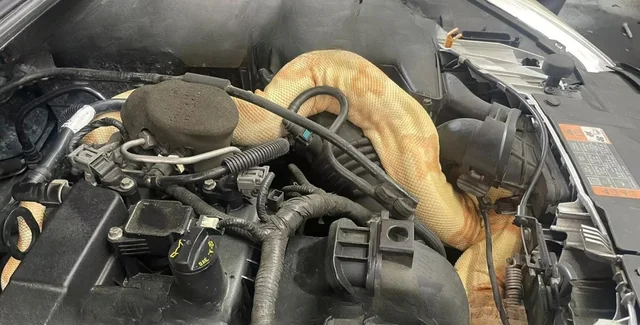 Ford Focus 2015 года пригнали на сервис для планового техобслуживания – замены масла и фильтров. Механик поднял капот и застыл – вокруг 2,0-литрового двигателя обвилась огромная 2,4-метровая змея со светлой кожей.