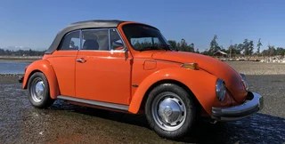 Этот Volkswagen Super Beetle Convertible окрашен в яркий оранжевый цвет. Внешний вид дополняют 15-дюймовые стальные колесные диски с хромированными вставками.