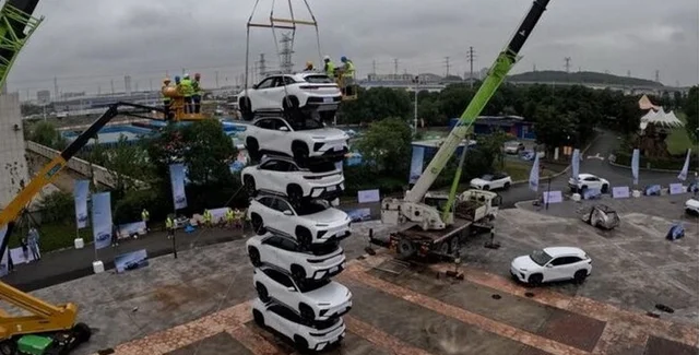 Тест на прочность: в Китае соорудили башню из электромобилей (фото)