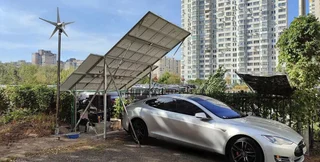 Станцию зарядки обустроил себе владелец Tesla Model S на парковке среди многоэтажек. Она использует возобновляемую энергию – питается от солнечных батарей и небольшого ветрогенератора, которые занимают относительно немного места.