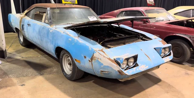 Спорткар покрыт ржавчиной, а в его передней части видны вмятины от незначительного ДТП. К тому же, авто перекрасили с желтого в синий цвет. Салон купе неплохо сохранился, а вот двигатель Plymouth Superbird требует ремонта.