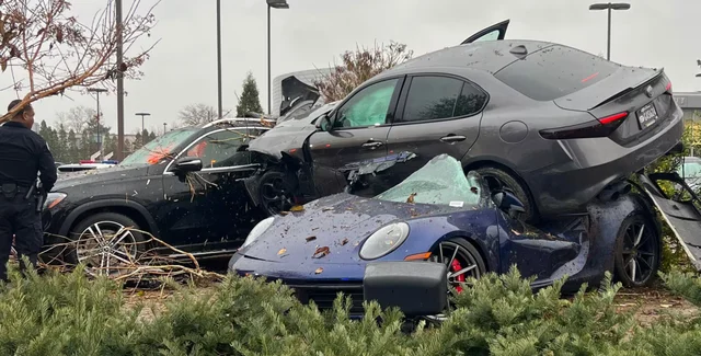 Механик не справился с мощным 510-сильным авто, потерял управление, врезался в дерево и вылетел на парковку. Там Alfa Romeo приземлилась на крышу Porsche 911 и протаранила Mercedes GLE, а тот, в свою очередь, зацепил Dodge Charger Hellcat.