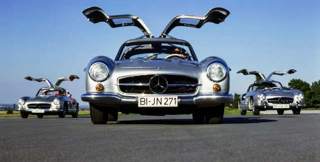 Mercedes-Benz 300 SL первым в мире получил инжекторный двигатель и был самым быстрым авто своего времени, однако прославился, прежде всего, благодаря необычным дверям типа "крыло чайки".