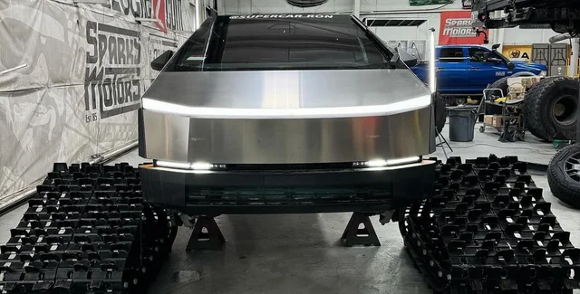 В США выполнили необычный тюнинг Tesla Cybertruck. Вместо колес на электрический пикап установили широкие гусеницы.