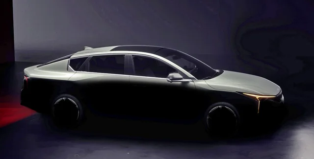 Дизайн выдержан в духе младшего седана Kia K3. У авто вытянутый силуэт с длинным капотом, покатой крышей крышей и высокой оконной линией. Ручки задних дверей спрятаны в стойках. Также на фото можно разглядеть тоненькие стреловидные фары и фонари.