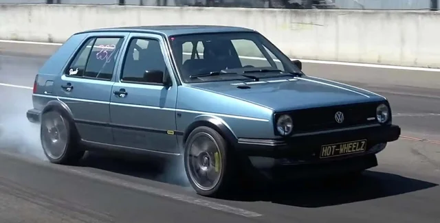 На соревнованиях по драгрейсингу на трассе Лаузицринг близ Берлина выступил необычный Volkswagen Golf 2. Старенькое компактное авто превратили в настоящий гоночный снаряд. Видео с ним опубликовали на Youtube-канале VeeDubRacing.