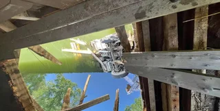 Деревянный пролет моста не выдержал Ford F-750 и грузовик провалился в воду. Водителя спасли, однако мост нуждается в серьезном ремонте — в нем образовалась огромная дыра. Дорогу перекрыли и теперь местные жители должны двигаться в объезд.