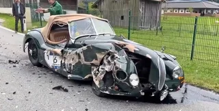 А вот спорткар Jaguar XK120 получил существенные повреждения. Его передняя часть почти полностью уничтожена. Восстановление авто будет длительным и недешевым.