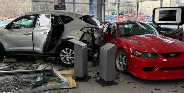 Курьезное ДТП произошло в штате Северная Каролина. Отмечается, что водитель пенсионного возраста потерял контроль над своим Hyundai Tucson и на большой скорости влетел в помещение автосалона. Кроссовер пробил стеклянную стену и врезался в Ford Mustang SVT SVT Cobra R.
