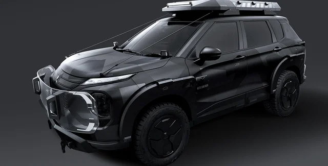 Mitsubishi Outlander получил пластиковый обвес, расширители арок и внедорожные шины. На крыше установили багажник, а спереди — прозрачный защитный экран. Кроме того, кроссовер отличается матовой окраской.