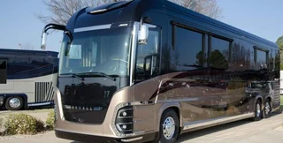 В основе Newell P50 лежит 13,7-метровый трехосный автобус. Дом на колесах весит 28,8 тонны, оснащен 605-сильным турбодизелем Cummins, автоматической КПП и пневмоподвеской. Ширину увеличивают выдвижные секции в боковинах.