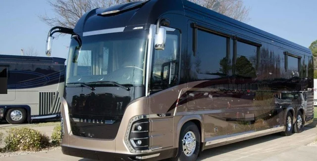 В США продают люксовый дом на колесах Newell P50 2019 года. В его салоне есть большая кухня, спальня с широкой кроватью и даже спа-центр.