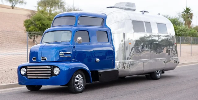 Кабину Ford COE удлинили и соединили с классическим стальным кемпером Airstream и установили конструкцию на рамное шасси General Motors P30. Дом на колесах достигает 9 метров в длину.