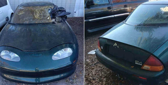 Электромобиль GM EV1 случайно обнаружили в городе Атланта, где он длительное время простоял на улице. Он покрыт слоем пыли и грязи, на кузове видны повреждения, а лобовое стекло разбито. Авто не способно передвигаться самостоятельно и его транспортировали на эвакуаторе.