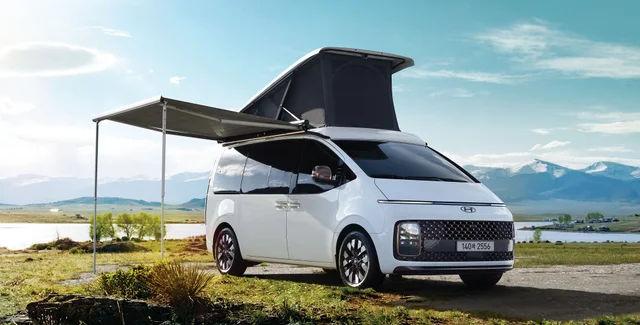 Футуристический минивэн Hyundai Staria получил подъемную крышу для увеличения внутреннего пространства и раскладной тент. В его салоне передние сиденья разворачиваются на 180 градусов, а кресла второго и третьего ряда раскладываются и образуют двуспальную кровать. Также есть два раскладных стола и несколько шкафов.