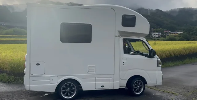 Компактный грузовик Daihatsu Hijet превратили в уютный автодом Star Happy 1. Внутри есть спальные места, кухня, умывальник и стол.