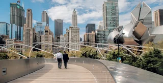 На всем протяжении побережье внутри города изобилует парками — в них есть чем заняться не только бегающим по утрам жителям, но и заезжим туристам. Южнее пирса расположен Грант-парк со знаменитым цветным фонтаном. В северной части зеленого массива (это место называется Миллениум-парк), на крыше огромного паркинга, находятся сразу три достопримечательности. Это первая в США скульптура Аниша Капура Cloud Gate, называемая горожанами просто "фасоль" — причудливый зеркальный объект с сюрреалистическим отражением города на его поверхности. Здесь же расположен фонтан с видеоэкранами под слоем воды, транслирующими говорящие лица горожан. А венчает парк огромная концертная площадка авторства Фрэнка Оуэна Гери, похожая на космический объект.