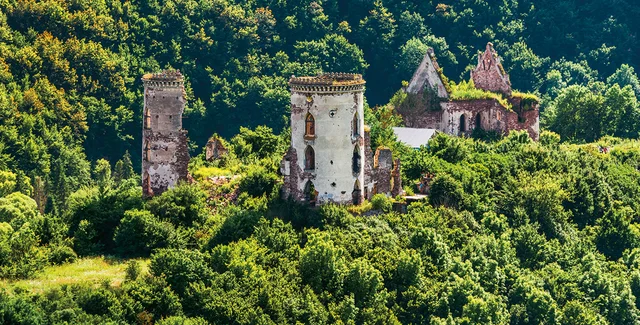 Полторы круглые готические зубчатые башни — это все, что сохранилось от великолепного дворца, стоявшего в живописном межгорье Залещицкого района Тернопольской области
