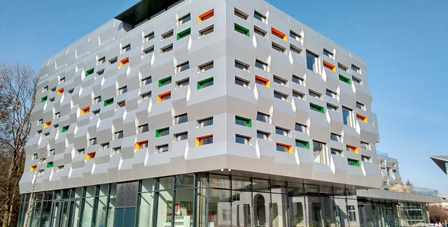 У Бениша демократичный подход к проектированию. Когда он подготовил макет здания во Львове, то на презентацию позвал работников УКУ — от ректора до уборщиц, и они высказывали мнения и пожелания касательно здания. Функции Центра, общественная и образовательная, определили архитектуру здания. В Центре шесть этажей, есть нулевой, подвальный, где размещаются архив и помещения для работы студентов. Первый этаж с полностью открытым стеклянным фасадом — пространство, куда может зайти каждый. Здесь есть выставочный зал, читальный и конференц-зал, а также кафетерий и магазин, где можно купить книги и сувениры. На втором и третьем этажах размещается библиотека с островками для чтения, на четвертом — еще одна библиотека, коворкинг и учебные аудитории, на пятом — администрация вуза. У здания примечательный рельефный фасад с цветными вставками. Он спроектирован по просьбе отца Бориса Гудзяка, которому хотелось внести украинские мотивы в современную архитектуру. И немецкие специалисты вдохновились узорами вышивок и переплетениями нитей в тканях, чтобы создать такую поверхность. Ее покрывает композитный алюминий: этот материал выбран потому, что его легко и дешево мыть. Ведь строительство на территории университета продолжается, и в воздухе много пыли.