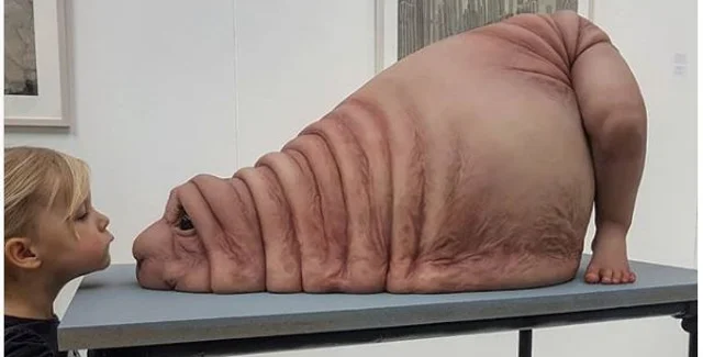Скульптура представляет собой морщинисте создание телесного цвета с огромными глазами и человеческими ногами. На фото неясно, сколько всего у создания конечностей. Художница уже попросила придумать ему имя. Хоть имя должно быть на английском, среди множества вариантов уже есть Лежун и Попрошун.